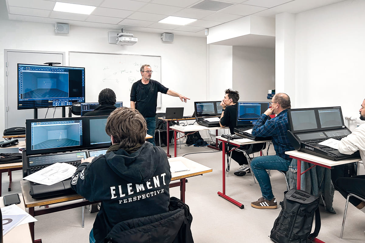 La 8e session de formation GrandMA3 s’est achevée en novembre au GRIM, encadrée par Yann Lahouste et Jean-Christophe Fayolle. Ce cycle composé de deux modules (bases et approfondissements) permet aux pupitreurs lumière d’aborder la programmation d’un show, l’encodage complet et l’usage des fonctions avancées. Les participants travaillent également sur l’organisation du workflow et la gestion des projecteurs asservis. Chaque stagiaire dispose d’une console dédiée (Light, Compact XT ou onPC) ainsi que d’un visualiseur 3D en temps réel. Une nouvelle session est programmée pour mi-mars 2026.
