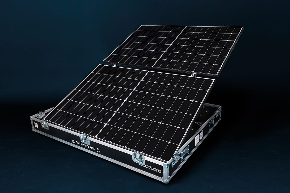 Pour alimenter les systèmes en énergie solaire et accroître leur autonomie, des structures solaires adaptées aux événements sont proposées. Le FlyPV 1700 est une station solaire mobile conçue par PikiP pour répondre aux usages du secteur événementiel et aux contraintes de terrain. Elle intègre quatre panneaux solaires dans un flight-case compact (4 × 435 Wp) et peut être mise en place en environ cinq minutes par deux personnes, sans outils. L’équipement est compatible avec les batteries standard et peut être utilisé en installations mobiles ou fixes.