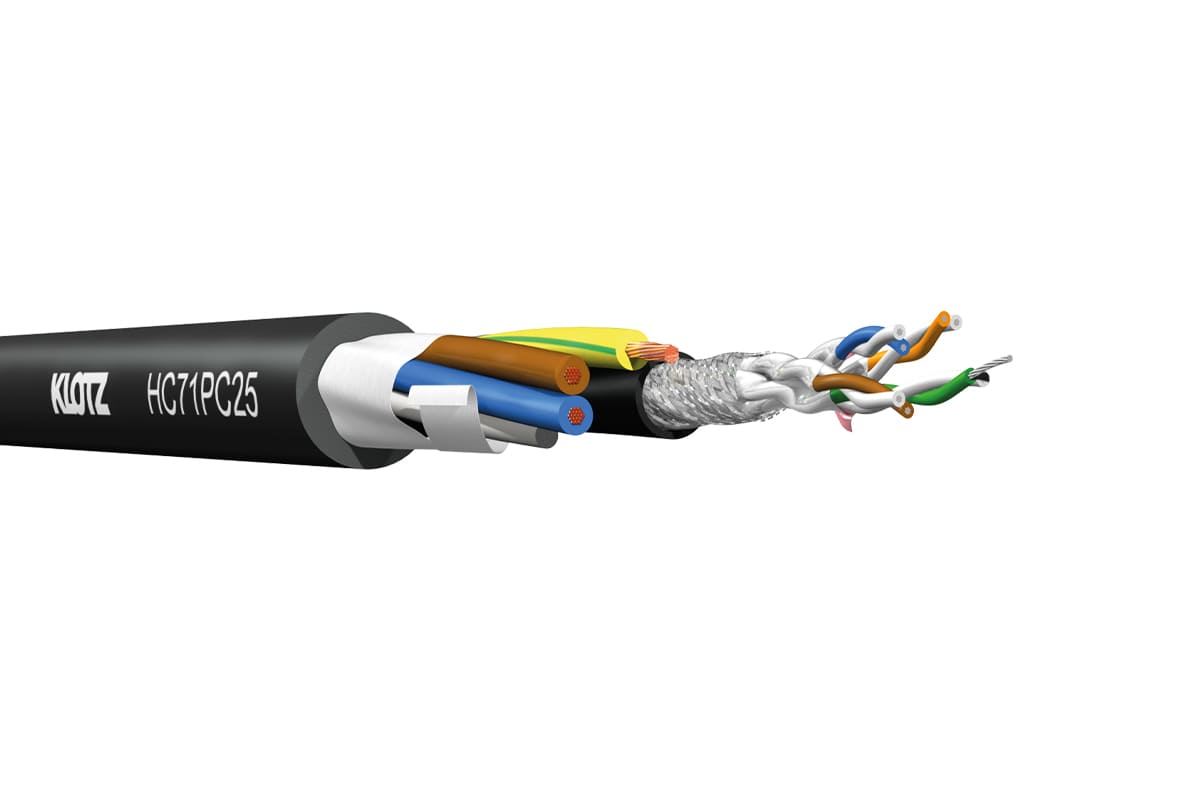 Les câbles hybrides combinent lignes de données et d’alimentation dans un seul câble. La référence compacte Klotz HC71PC25 a été spécialement développée pour les usages mobiles. Ce modèle dispose d’une gaine extérieure en PVC souple, robuste et hautement flexible. Le câble CAT7 permet de connecter des systèmes de réseaux audionumériques ou de transmettre des signaux de contrôle DMX basés sur les protocoles ArtNet, MA-Net ou Pathport. Le HC71PC25 convient également aux applications informatiques jusqu’à 10 Gbits/s. La ligne d’alimentation est composée de trois conducteurs en cuivre nu, multibrins, de 2,5 mm².