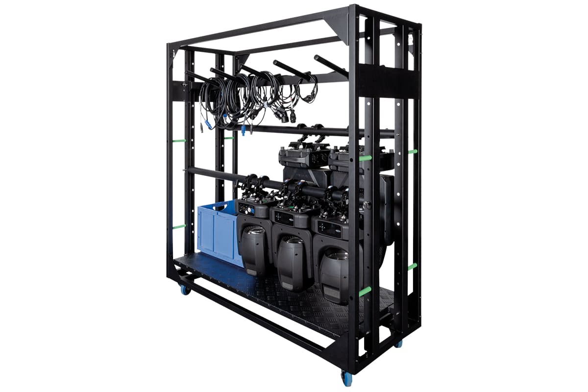 La gamme Loadmaster comprend quatre chariots « meatrack » en acier haute résistance. Chaque chariot supporte une charge utile répartie (UDL) de 500 kg et est équipé de roulettes pivotantes Penn Elcom de 100 mm avec freins. Les racks acceptent divers accessoires modulaires, réglables en hauteur : fixture bars pour projecteurs, cable bars pour câbles, et rack shelves pour rangement plat. Deux chariots à plaques de base permettent le stockage et le transport d’embases de structures universelles. Le modèle le plus grand peut également servir de table de contrôle grâce à un profil latéral amovible.